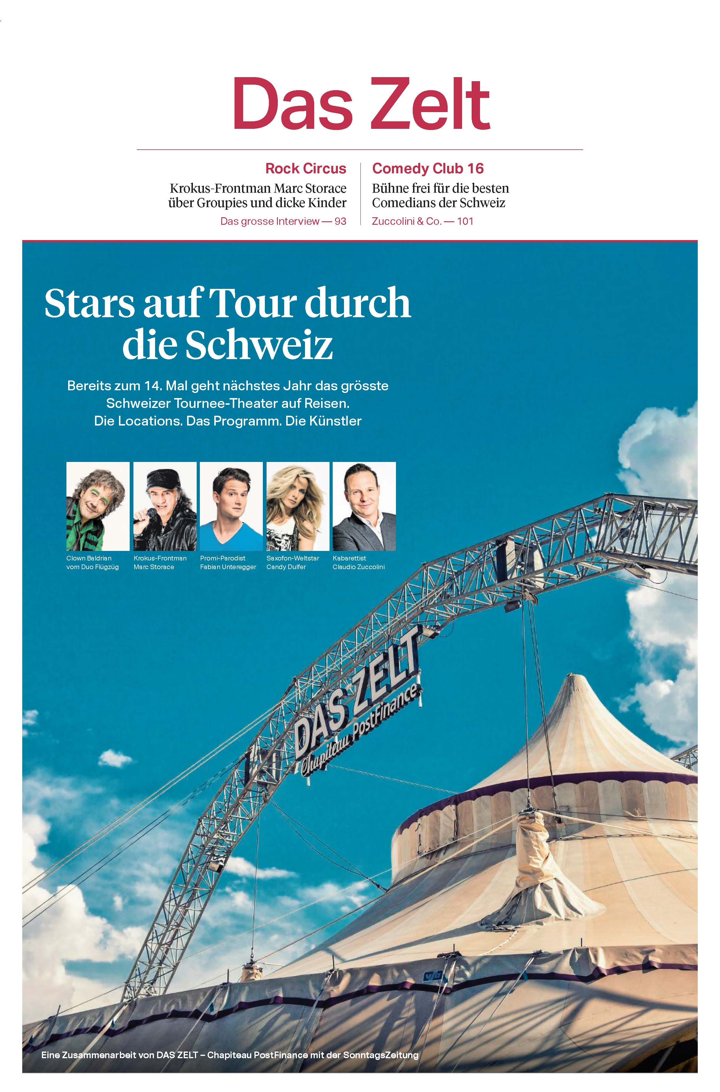 20-seitige Beilage im Auftrag von Gregory Knies Wanderzirkus „Das Zelt“, erschienen in der SonntagsZeitung (Tamedia Verlag) Schweiz.